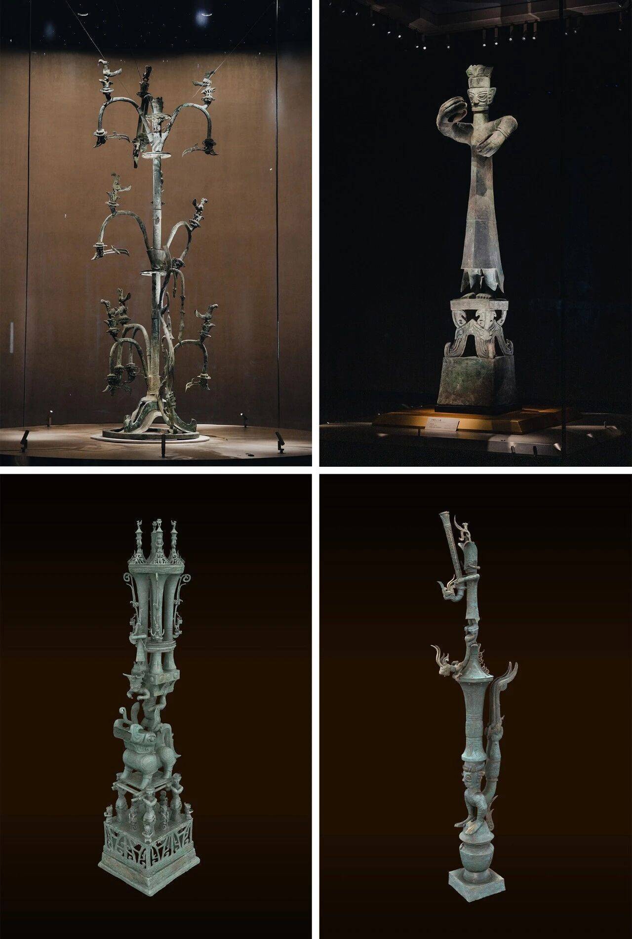 图为三星堆博物馆部分文物:左上为一号青铜神树、右上为青铜立人像、左下为青铜神坛(研究性复原)、右下为青铜鸟足神像(研究性复原)。三星堆博物馆供图
