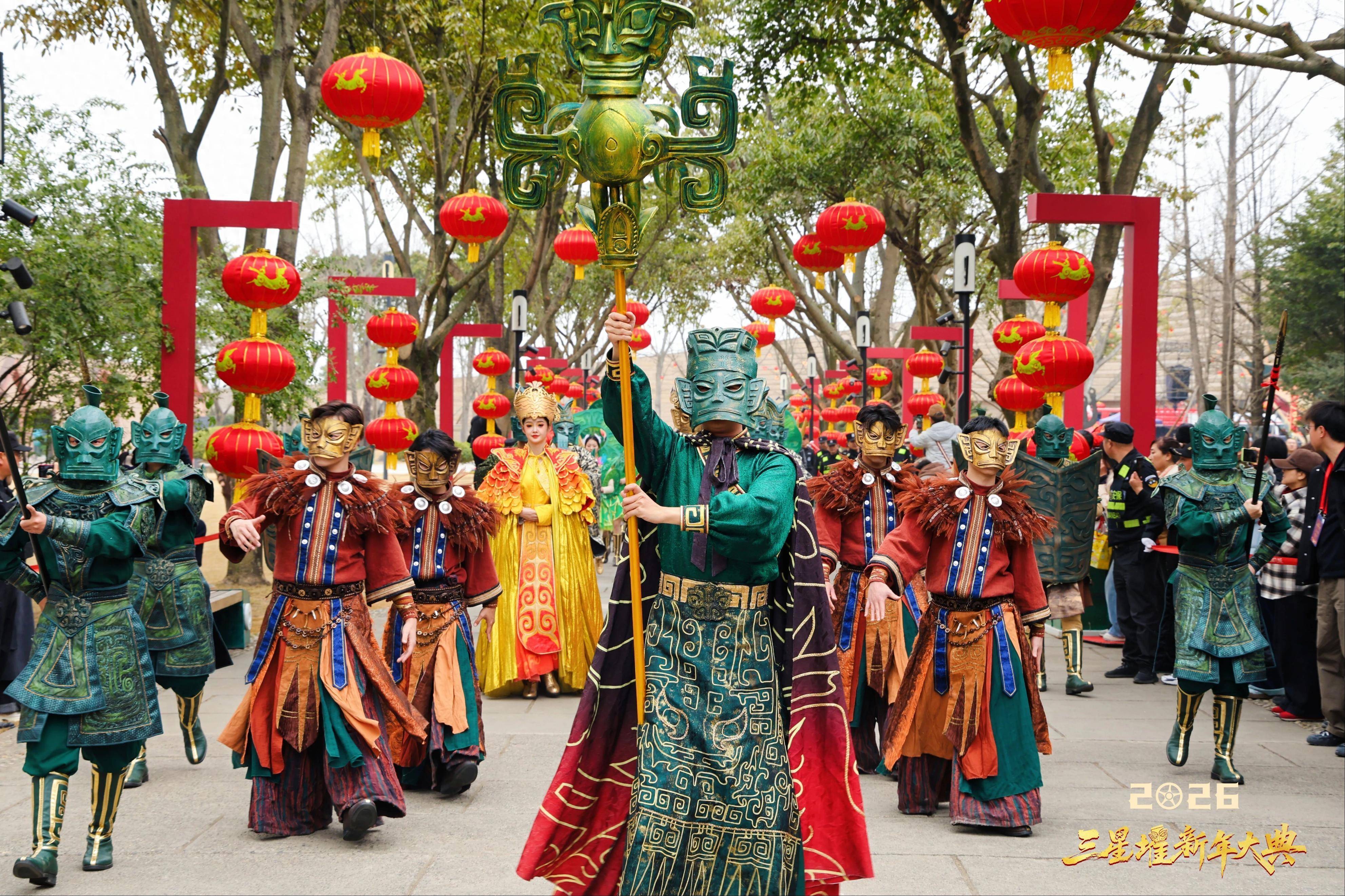 三星堆里过大年,古蜀圣地祈新福。2026年正月初一至初七,三星堆博物馆推出“新年大典”,将沉浸式演艺、跨界互动与新春祈愿深度融合。图为“古蜀祈福游行”活动现场。三星堆博物馆供图