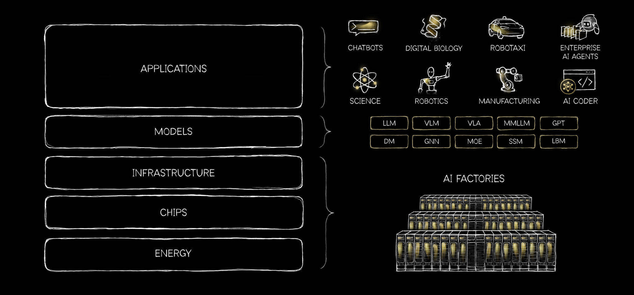 这就是“五层蛋糕”架构:能源 → 芯片 → 基础设施 → 模型 → 应用。