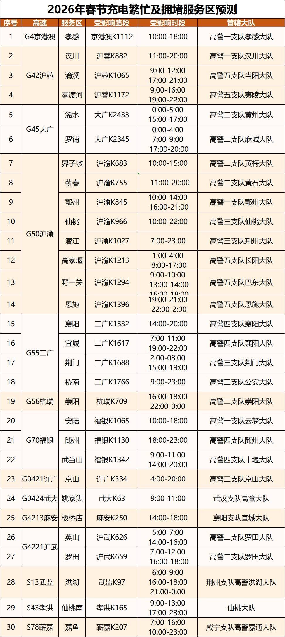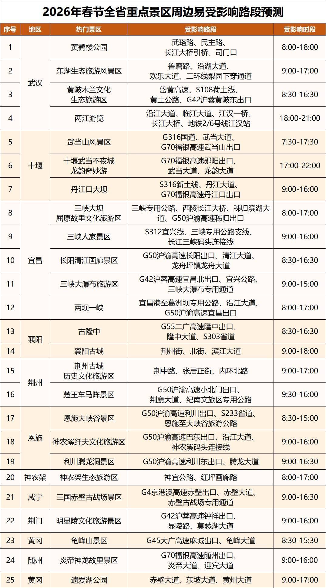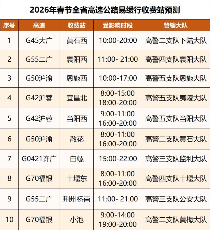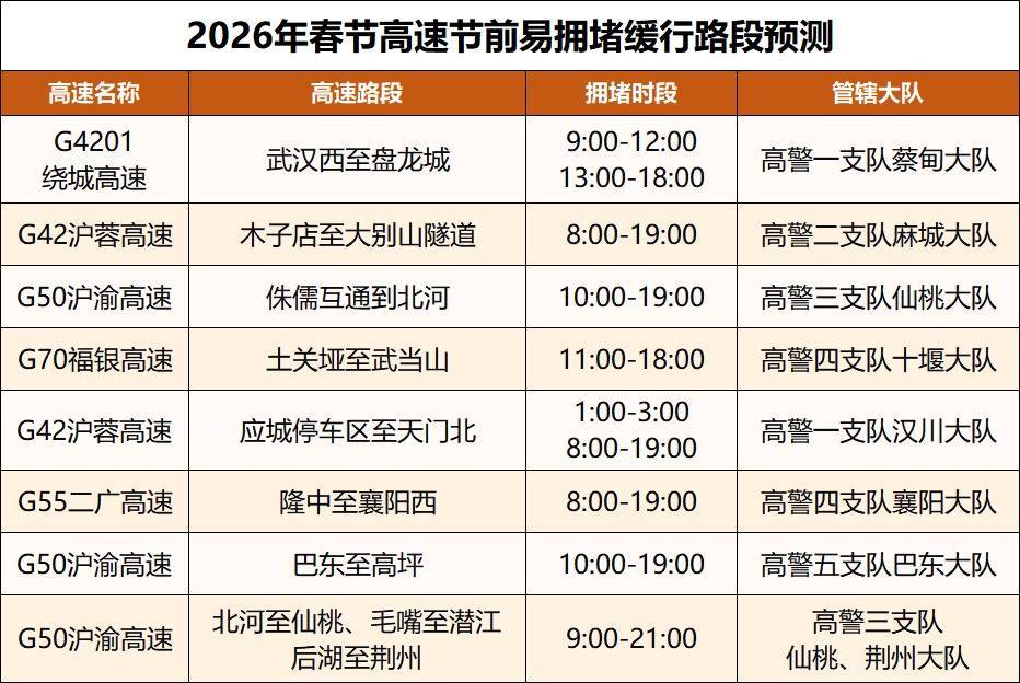 春节期间,沪渝高速黄黄、汉宜段,福银高速黄小段等“四改八”改扩建施工持续推进,施工路段存在改道绕行、单幅双向、路面变窄、匝道封闭等情况,导致通行效能降低,易出现拥堵缓行。