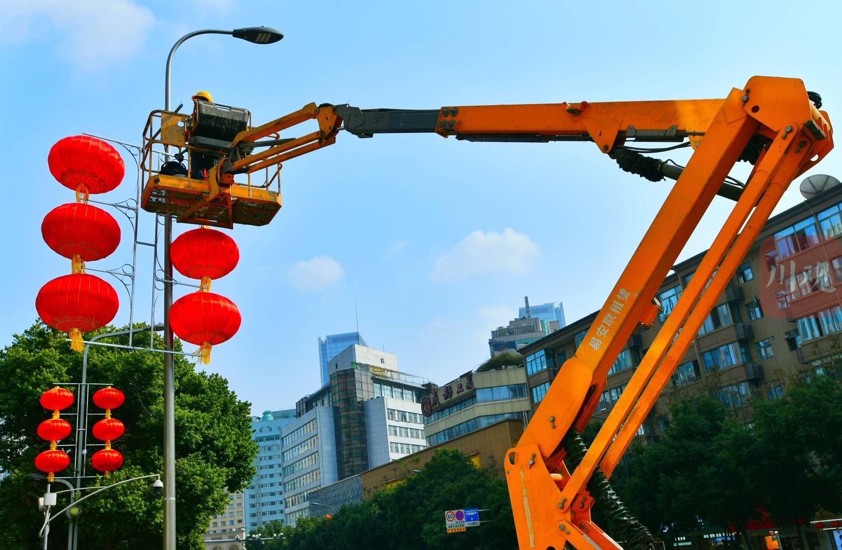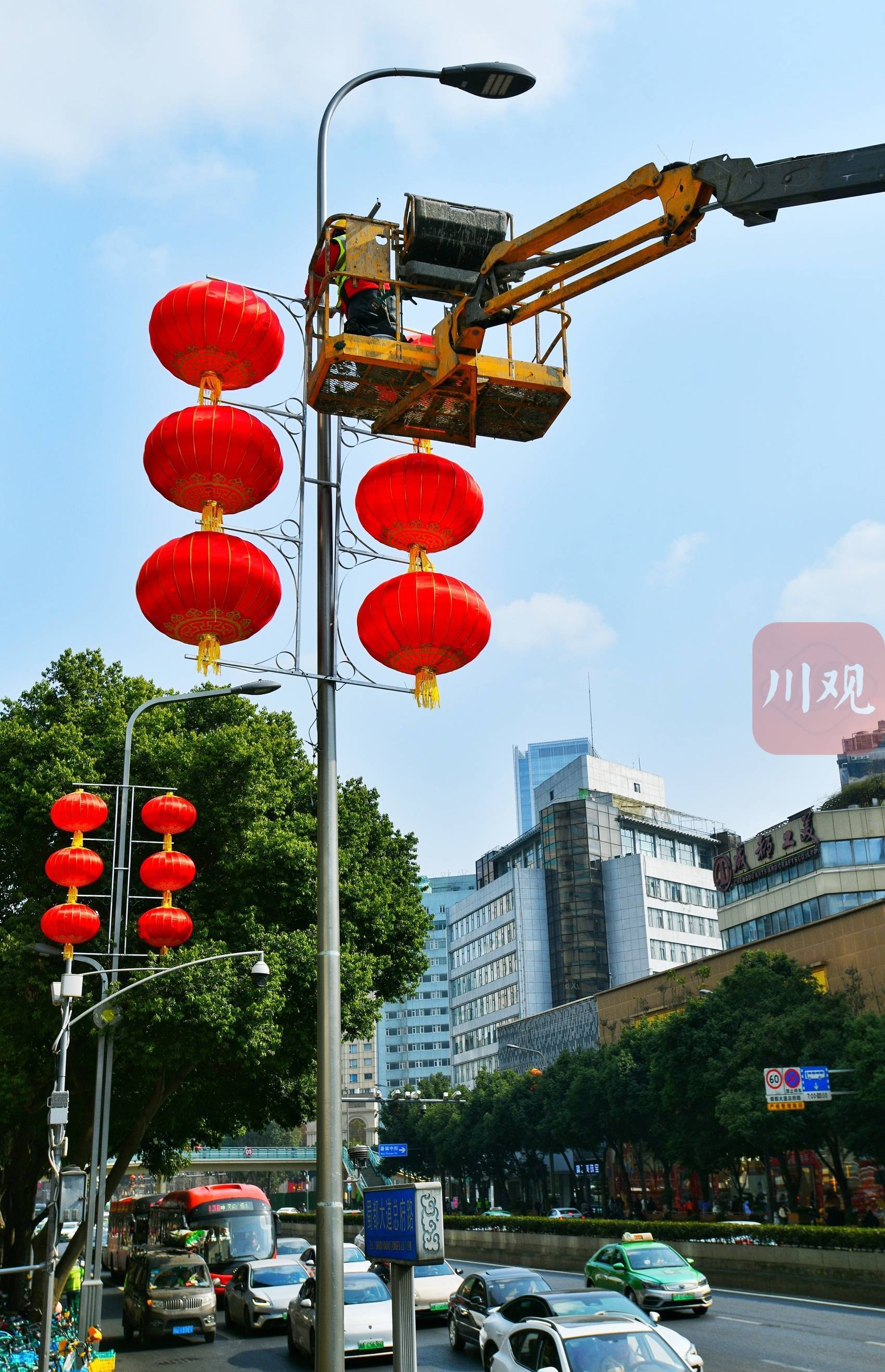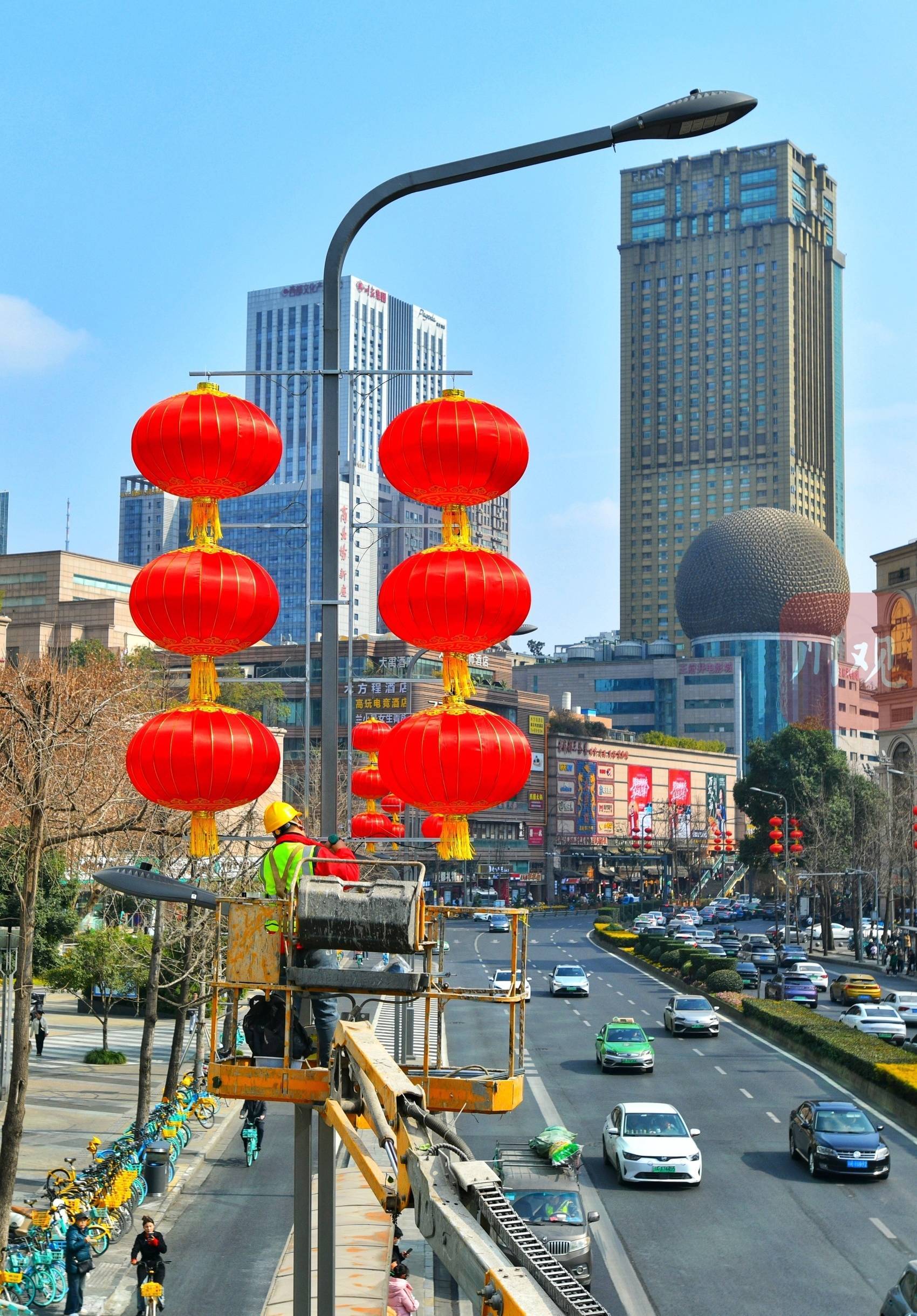 2月1日,冬日蓉城,暖意融融。蜀都大道上,春节氛围装点工作已启动。施工人员将一组组大红灯笼(每组6个)精心悬挂于主干道两侧。红灯映暖阳,满城气象新,热烈的节日气息扑面而来。